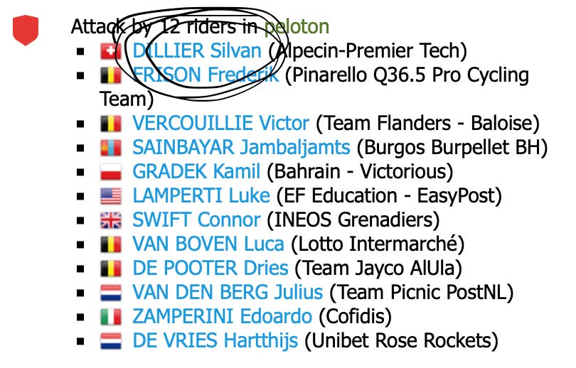 Toen UAE (met Florian Vermeersch op kop) doortrok op de Molenberg en er een groep favorieten zich afscheidde van het peloton, was het niet aan VDP om op kop te rijden. Mads Pedersen deed het ook niet, Wout van Aert nauwelijks. Matje was de enige van de vedetten die ook nog een ploegmaat in de vroege vlucht had zitten: Silvan Dillier. Nul komma nul reden om mee te draaien op kop van de groep.