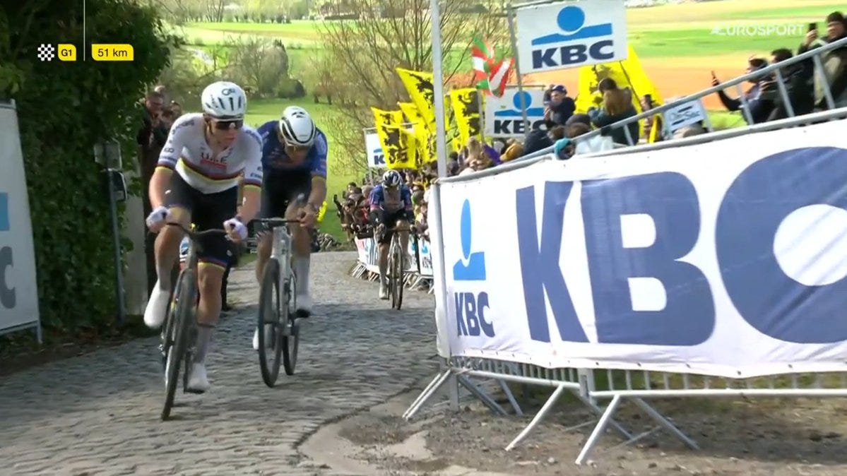 Tegen Pogacar koersen is heel makkelijk en heel moeilijk tegelijk. Heel makkelijk omdat je van tevoren precies weet wat ie gaat doen, heel moeilijk omdat ie vaak zo hard gaat dat je ‘m alsnog niet kunt volgen. Dat Pogi óók in de editie van dit jaar zijn slag zou slaan op de Oude Kwaremont stond van tevoren in chocoladeletters op zijn voorhoofd geschreven. Iedereen wist het; hij had net zo goed folders met het tactische plan van UAE kunnen uitdelen bij de start.