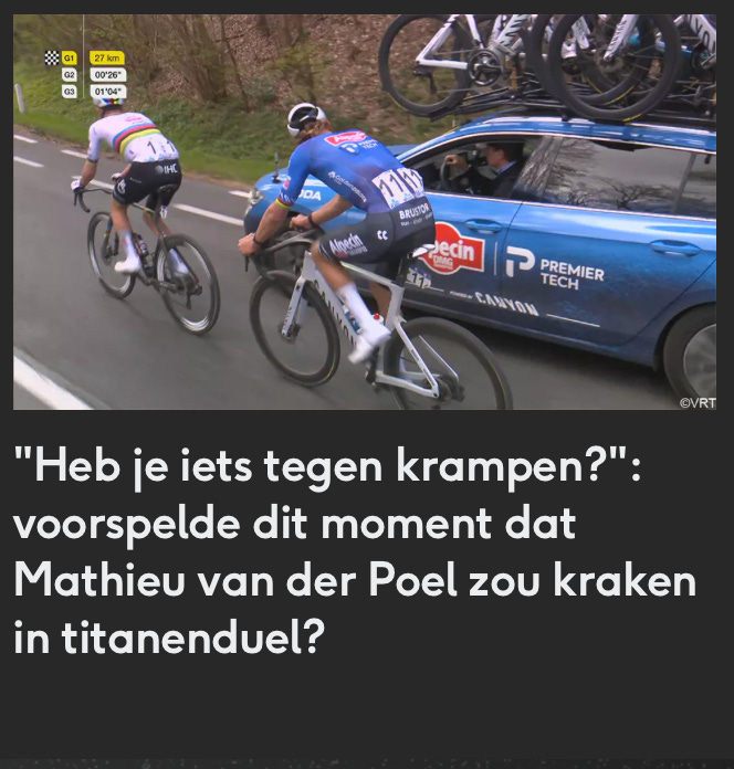 En hij betaalde er de prijs voor. Op de laatste Kwaremont loste Van der Poel, net als in 2023, net als in 2025. Op de top was het verschil nondeju 6 hele seconden. Dan kan hij keer op keer zeggen dat Pogacar te sterk was, maar hij was er zó dichtbij. Wat als hij de honderd kilometer ervoor níet mee op kop had gereden? Waren al die kleine hapjes die 6 seconden waard?